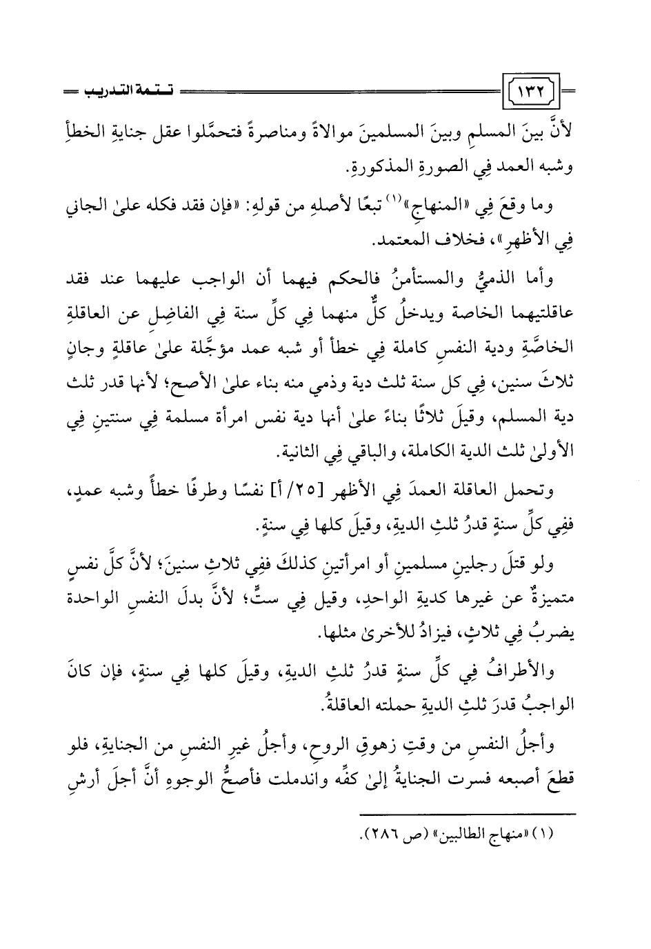 وأما الذميُّ والمستأمنُ فالحكم فيهما أن الواجب عليهما عند فقد عاقلتيهما الخاصة ويدخلُ كلٌّ منهما في كلِّ سنة في الفاضِلِ عن العاقلةِ الخاصَّةِ ودية النفسِ كاملة في خطأ أو شبه عمد مؤجَّلة على عاقلةٍ وجانٍ ثلاثَ سنين، في كل سنة ثلث دية وذمي منه بناء على الأصح؛ لأنها قدر ثلث دية المسلم، وقيلَ ثلاثًا بناءً على أنها دية نفس امرأة مسلمة في سنتينِ في الأولى ثلث الدية الكاملة، والباقي في الثانية.