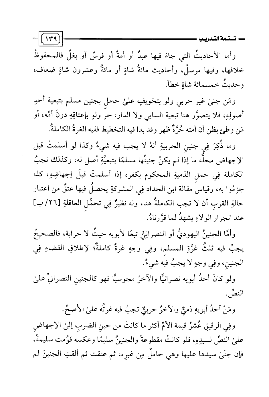وما ذُكِرَ في جنينِ الحربيةِ أنهُ لا يجب فيه شيءٌ وكذا لو أسلمتْ قبل الإجهاض محلُّه ما إذا لم يكنْ جنينُها مسلمًا بتبعيَّةِ أصل له، وكذلك تجبُ الكاملة في حملِ الذميةِ المحكوم بكفره إذا أسلمتْ قبلَ إجهاضِهِ، كذا جزمُوا به، وقياس مقالة ابن الحداد في المشركةِ يحصلُ فيها عتقٌ من اعتبار حالةِ القربِ أن لا تجب الكاملةُ هنا، وله نظيرٌ في تحمُّلِ العاقلةِ عند انجرار الولاءِ يشهدُ لما قرَّرناهُ.