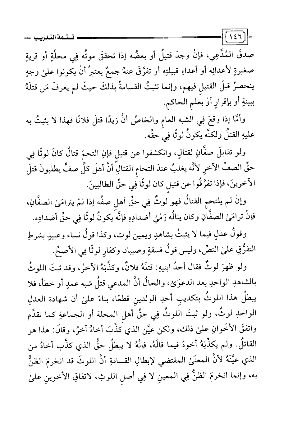ولو تقابلَ صفَّانِ لقتالٍ، وانكشفوا عن قتيلٍ فإنِ التحمَ قتالٌ كانَ لوثًا في حقِّ الصفِّ الآخرِ لأنَّه يغلبُ عندَ التحامِ القتالِ أنَّ أهلَ كلِّ صفٍّ يطلبونَ قتلَ الآخرينَ، فإذا تفرَّقُوا عن قتيلٍ كان لوثًا في حقِّ الطالبينَ.