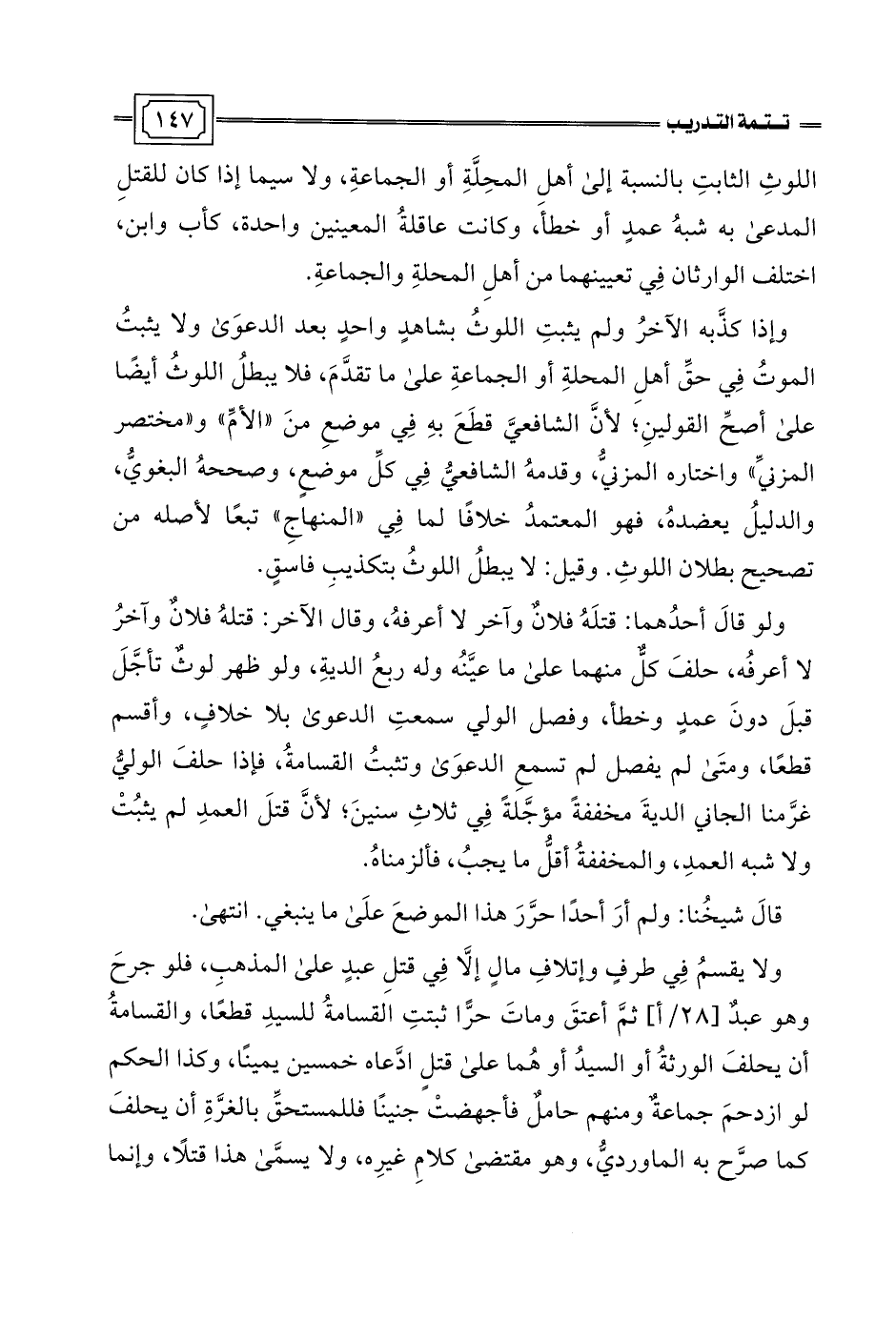 اللوثِ الثابتِ بالنسبة إلى أهل المحِلَّةِ أو الجماعةِ، ولا سيما إذا كان للقتلِ المدعى به شبهُ عمدٍ أو خطأَ، وكانت عاقلةُ المعينين واحدة، كأب وابن، اختلف الوارثان في تعيينهما من أهلِ المحلةِ والجماعةِ.