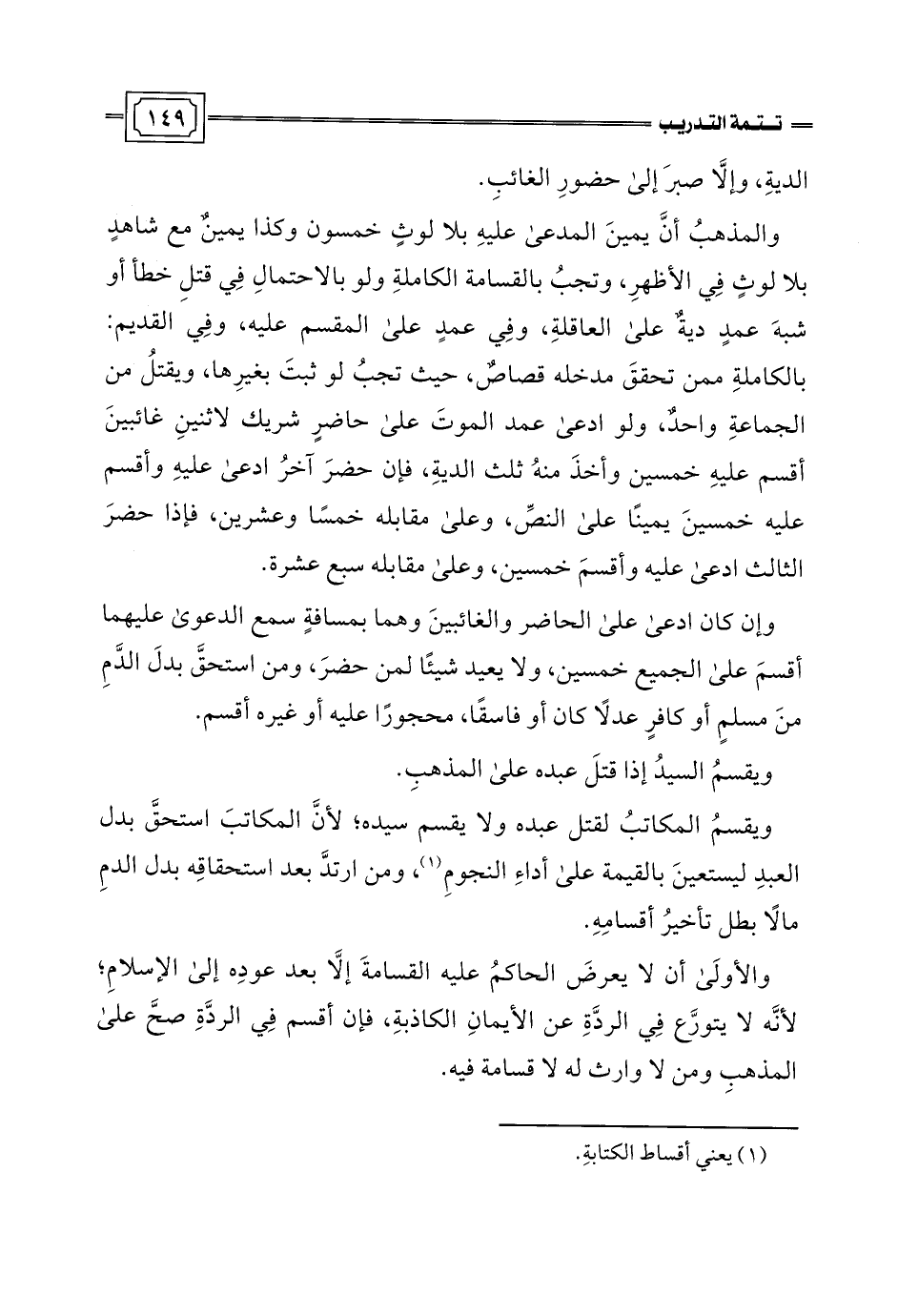 والمذهبُ أنَّ يمينَ المدعى عليهِ بلا لوثٍ خمسون وكذا يمينٌ مع شاهدٍ بلا لوثٍ في الأظهرِ، وتجبُ بالقسامة الكاملةِ ولو بالاحتمالِ في قتلِ خطأ أو شبهَ عمدٍ ديةٌ على العاقلةِ، وفِي عمدٍ على المقسم عليه، وفِي القديم: بالكاملةِ ممن تحققَ مدخله قصاصٌ، حيث تجبُ لو ثبتَ بغيرِها، ويقتلُ من الجماعةِ واحدٌ، ولو ادعى عمد الموتَ على حاضرٍ شريك لاثنينِ غائبينَ أقسم عليهِ خمسين وأخذَ منهُ ثلث الديةِ، فإن حضرَ آخرُ ادعى عليهِ وأقسم عليه خمسينَ يمينًا على النصِّ، وعلى مقابله خمسًا وعشرين، فإذا حضرَ الثالث ادعى عليه وأقسمَ خمسين، وعلى مقابله سبع عشرة.
