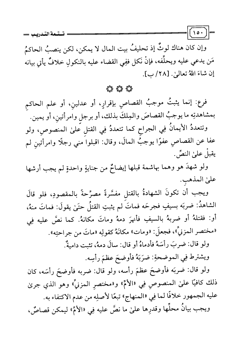 ويجب أن تكونَ الشهادةُ بالقتلِ مفسَّرةً مصرِّحةً بالمقصودِ، فلو قالَ الشاهدُ: ضربَه بسيفٍ فجرحَه فماتَ لم يثبتِ القتلُ حتَى يقولَ: فماتَ منهُ، أو: فقتلهُ أو ضربهُ بالسيفِ فأنهرَ دمهُ وماتَ مكانهُ. كما نصَّ عليه في "مختصر المزنيِّ"، فجعلَ: "ومات" مكانَهُ كقولِه "ماتَ من جراحتِه".