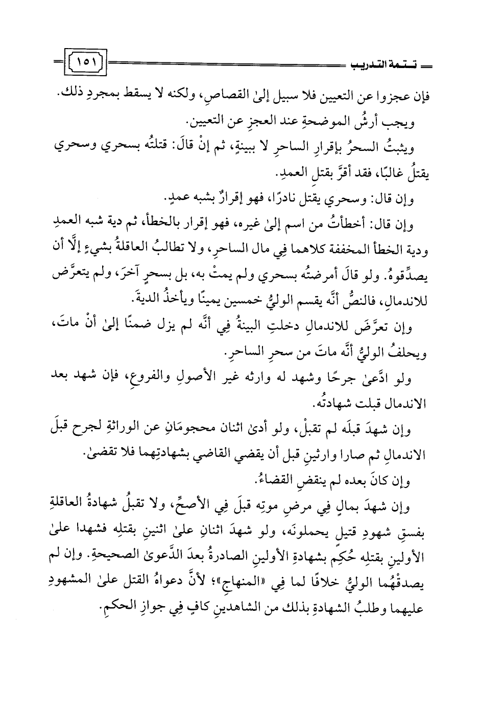 وإن قال: أخطأتُ من اسم إلى غيره، فهو إقرار بالخطأ، ثم دية شبه العمدِ ودية الخطأ المخففة كلاهما في مال الساحرِ، ولا تطالبُ العاقلةُ بشيءٍ إلَّا أن يصدِّقوهُ. ولو قالَ أمرضتُه بسحري ولم يمتْ به، بل بسحرٍ آخرَ، ولم يتعرَّض للاندمالِ، فالنصُّ أنَّه يقسم الوليُّ خمسين يمينًا ويأخذُ الديةَ.