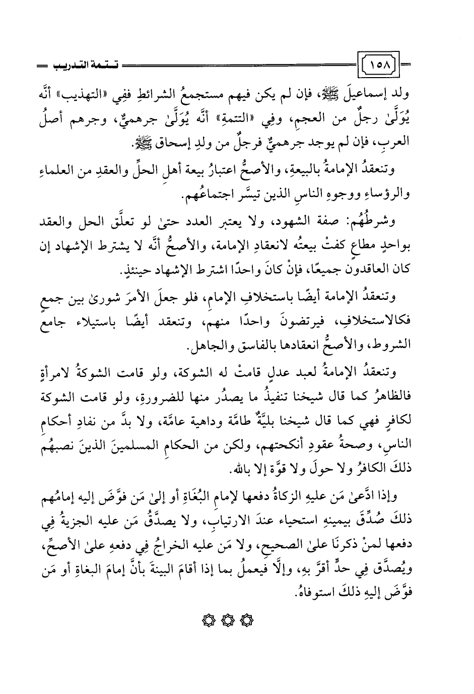 وتنعقدُ الإمامةُ لعبد عدلٍ قامتْ له الشوكة، ولو قامت الشوكةُ لامرأةٍ فالظاهرُ كما قال شيخنا تنفيذُ ما يصدُر منها للضرورةِ، ولو قامت الشوكة لكافرٍ فهي كما قال شيخنا بليَّةٌ طامَّة وداهية عامَّة، ولا بدَّ من نفادِ أحكامِ الناسِ، وصحةُ عقودِ أنكحتهم، ولكن من الحكامِ المسلمينَ الذينَ نصبهُم ذلكَ الكافرُ ولا حولَ ولا قوَّة إلا باللَّه.