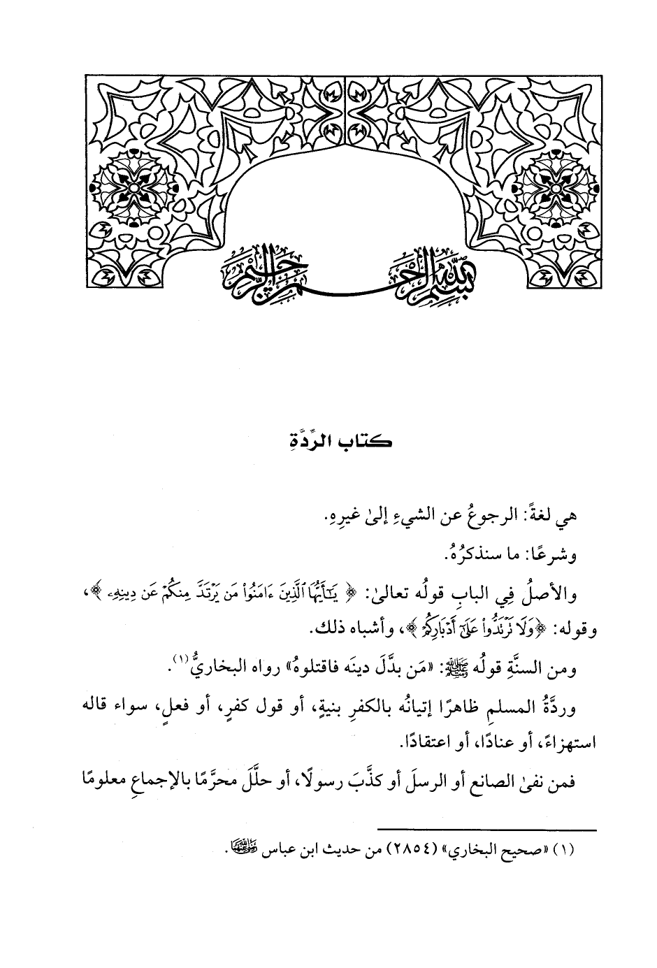 والأصلُ في البابِ قولُه تعالى: {يَاأَيُّهَا الَّذِينَ آمَنُوا مَنْ يَرْتَدَّ مِنْكُمْ عَنْ دِينِهِ}، وقوله: {وَلَا تَرْتَدُّوا عَلَى أَدْبَارِكُمْ}، وأشباه ذلك.