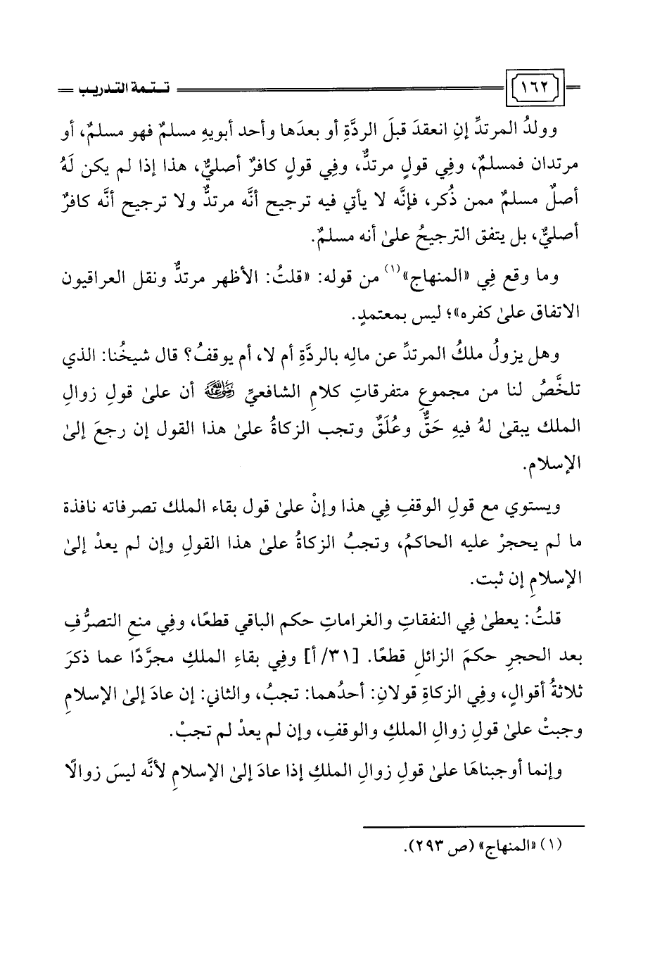وهل يزولُ ملكُ المرتدِّ عن مالِه بالردَّةِ أم لا، أم يوقفُ؟ قال شيخُنا: الذي تلخَّصُ لنا من مجموع متفرقاتِ كلامِ الشافعيِّ -رضي اللَّه عنه- أن على قولِ زوالِ الملك يبقى لهُ فيهِ حَقٌّ وعُلَقٌ وتجب الزكاةُ على هذا القول إن رجعَ إلى الإسلام.
