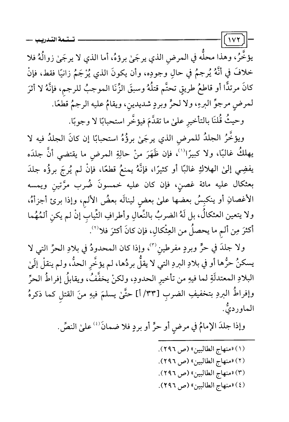 ويؤخَّرُ الجلدُ للمرضِ الذي يرجَى برؤُهُ استحبابًا إن كانَ الجلدُ فيه لا يهلكُ غالبًا، ولا كبيرًا (¬1)، فإن ظَهَرَ منْ حالِةِ المرضِ ما يقتضي أنَّ جلدَه يفضِي إلى الهلاكِ غالبًا أو كثيرًا، فإنَّهُ يمنعُ قطعًا، فإنْ لم يُرجَ برؤُه جلدَ بعثكال عليه مائة غصنٍ، فإن كان عليه خمسونَ ضُرب مرَّتينِ ويمسه الأغصانِ أو ينكبِسُ بعضها على بعضٍ لينالَه بعضُ الألمِ، وإذا برئ أجزأهُ، ولا يتعين العثكالُ، بل لَهُ الضربُ بالنِّعالِ وأطرافِ الثِّيابِ إنْ لم يكنِ ألمُهُما أكثرَ مِن ألمِ ما يحصلُ من العِثْكالِ، فإن كانَ أكثرَ فلا (¬2).
