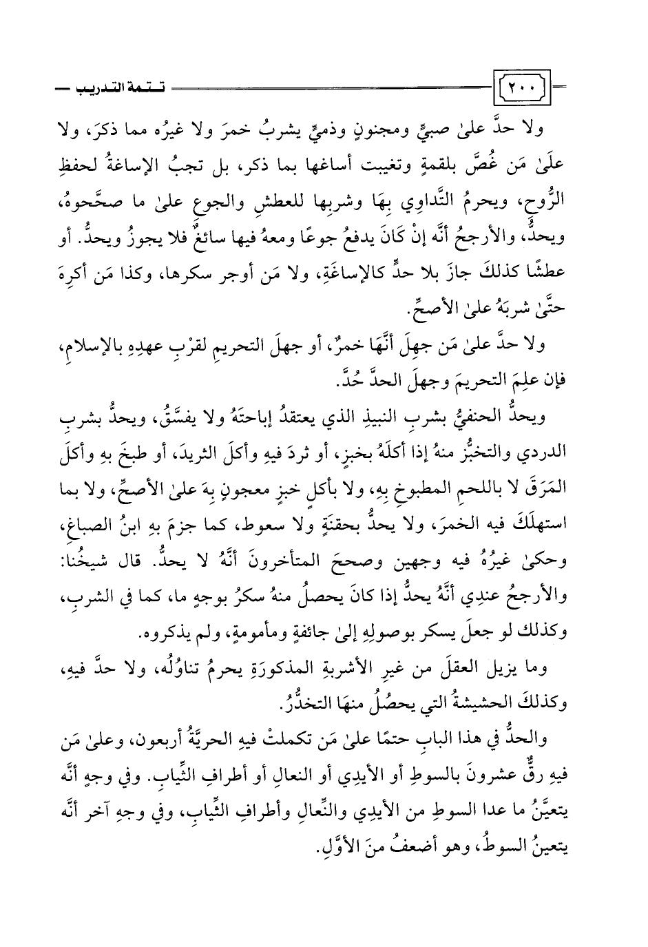 ولا حدَّ على صبيٍّ ومجنونٍ وذميٍّ يشربُ خمرَ ولا غيرُه مما ذكرَ، ولا علَى مَن غُصَّ بلقمةٍ وتغيبت أساغها بما ذكر، بل تجبُ الإساغةُ لحفظِ الرُّوحِ، ويحرمُ التَّداوِي بِهَا وشربِها للعطشِ والجوع على ما صحَّحوهُ، ويحدُّ، والأرجحُ أنَّه إنْ كَانَ يدفعُ جوعًا ومعهُ فيها سائغٌ فلا يجوزُ ويحدُّ. أو عطشًا كذلكَ جازَ بلا حدٍّ كالإساغَةِ، ولا مَن أوجر سكرها، وكذا مَن أكرِهَ حتَّى شربَهُ على الأصحِّ.