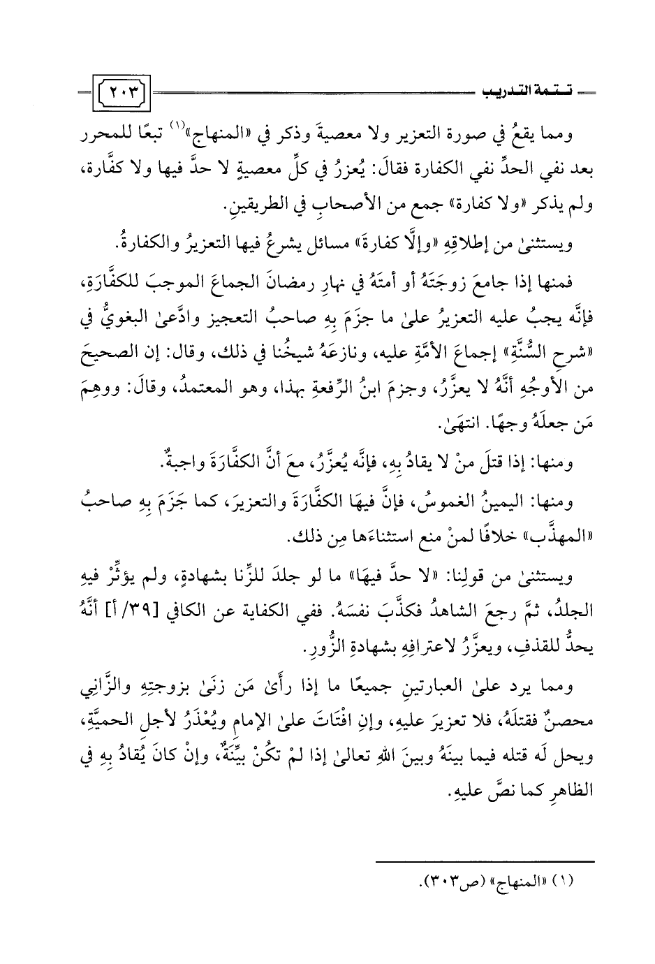 فمنها إذا جامعَ زوجَتَهُ أو أمتَهُ في نهارِ رمضانَ الجماعَ الموجبَ للكفَّارَةِ، فإنَّه يجبُ عليه التعزيرُ على ما جزَمَ بِهِ صاحبُ التعجيز وادَّعى البغويُّ في "شرحِ السُّنَّةِ" إجماعَ الأمَّةِ عليه، ونازعَهُ شيخُنا في ذلك، وقال: إن الصحيحَ من الأوجُهِ أنَّهُ لا يعزَّرُ، وجزمَ ابنُ الرِّفعةِ بهذا، وهو المعتمدُ، وقالَ: ووهِمَ مَن جعلَهُ وجهًا. انتهَى.