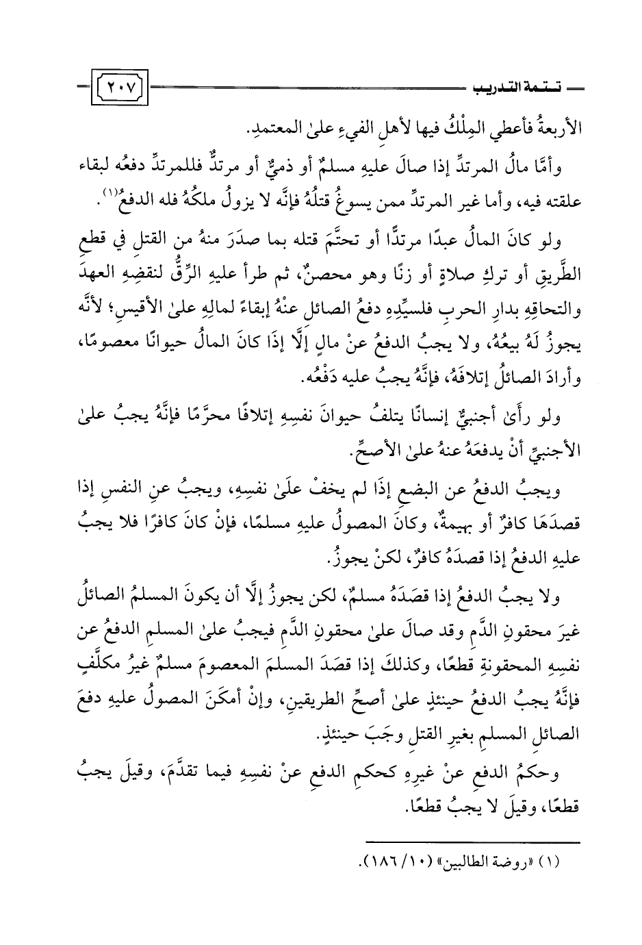 ولو كانَ المالُ عبدًا مرتدًّا أو تحتَّمَ قتله بما صدَرَ منهُ من القتلِ في قطعِ الطَّريقِ أو تركِ صلاةٍ أو زنًا وهو محصنٌ، ثم طرأ عليهِ الرِّقُّ لنقضهِ العهدَ والتحاقِهِ بدارِ الحربِ فلسيِّدِهِ دفعُ الصائلِ عنْهُ إبقاءً لمالِهِ على الأقيسِ؛ لأنَّه يجوزُ لَهُ بيعُهُ، ولا يجبُ الدفعُ عنْ مالٍ إلَّا إذَا كانَ المالُ حيوانًا معصومًا، وأرادَ الصائلُ إتلافَهُ، فإنَّهُ يجبُ عليه دَفْعُه.
