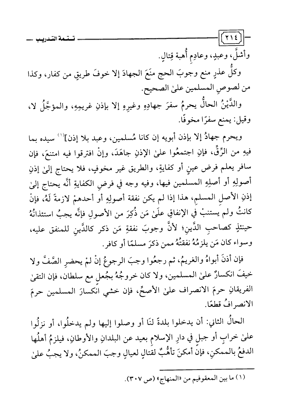 ويحرم جهادُ إلا بإذن أبويه إن كانا مُسلمين، وعبد بلا إذن] (¬1) سيده بما فيهِ من الرِّقِّ، فإنِ اجتمعُوا على الإذنِ جاهَدَ، وإنْ افترقوا فيه امتنعَ، فإن سافر يعلم فرض عينٍ أو كفايةٍ، والطريق غير مخوفٍ، فلا يحتاج إلى إذنِ أصولِهِ أو أصلِهِ المسلمين فيها، وفيه وجه في فرضِ الكفايةِ أنَّه يحتاج إلى إذنِ الأصلِ المسلمِ، هذا إذا لم يكن نفقة أصولِهِ أو أحدهمْ لازمةً لَهُ، فإنْ كانتُ ولم يستنبْ في الإنفاقِ علَى مَن ذُكِرَ من الأصولِ فإنَّه يجبُ استئذانُهُ حينئذٍ كصاحبِ الدَّينِ، لأنَّ وجوبَ نفقةِ مَن ذكر كالدَّينِ للمنفق عليه، وسواء كان مَن يلزمُهُ نفقتُهُ ممن ذكرَ مسلمًا أو كافر.