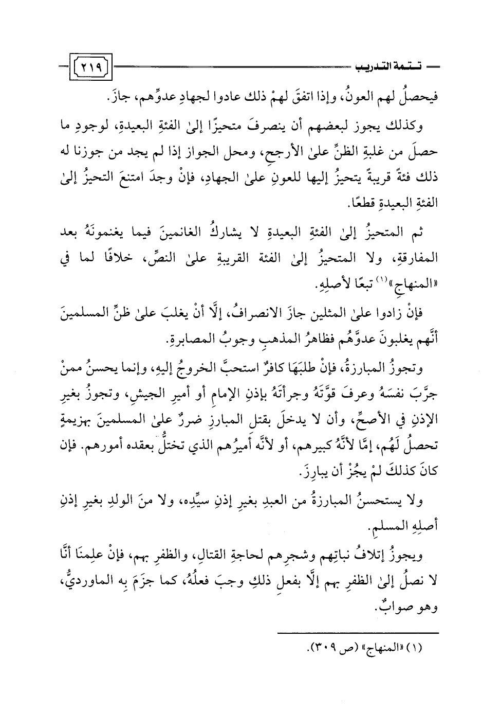 وكذلك يجوز لبعضهم أن ينصرفَ متحيزًا إلى الفئةِ البعيدةِ، لوجودِ ما حصلَ من غلبةِ الظنِّ على الأرجحِ، ومحل الجواز إذا لم يجد من جوزنا له ذلك فئةً قريبةً يتحيزُ إليها للعونِ على الجهادِ، فإنْ وجدَ امتنعَ التحيزُ إلى الفئةِ البعيدةِ قطعًا.