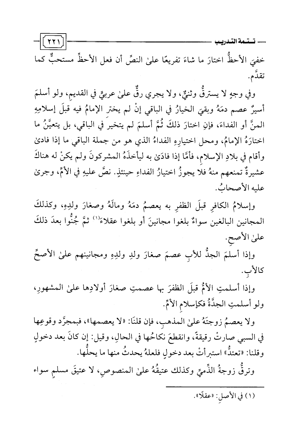 وفي وجهٍ لا يسترقُّ وثنيٌّ، ولا يجري رق على عربيٍّ في القديمِ، ولو أسلمَ أسيرٌ عصم دمَهُ وبقيَ الخيارُ في الباقي إنْ لم يخترِ الإمامُ فيه قبلَ إسلامِهِ المنَّ أو الفداءَ، فإنِ اختارَ ذلكَ ثُمَّ أسلمَ لم يتخير في الباقي، بل يتعيَّنُ ما اختارَهُ الإمامُ، ومحل اختيارِهِ الفداءُ الذي هو من جملة الباقي ما إذا فادى وأقام في بلادِ الإسلامِ، فأمَّا إذا فادَى به ليأخذَهُ المشركونَ ولم يكنْ له هناكَ عشيرةٌ تمنعهم منهُ فلا يجوزُ اختيارُ الفداءِ حينئذٍ. نصَّ عليهِ في الأمِّ، وجرى عليه الأصحابُ.
