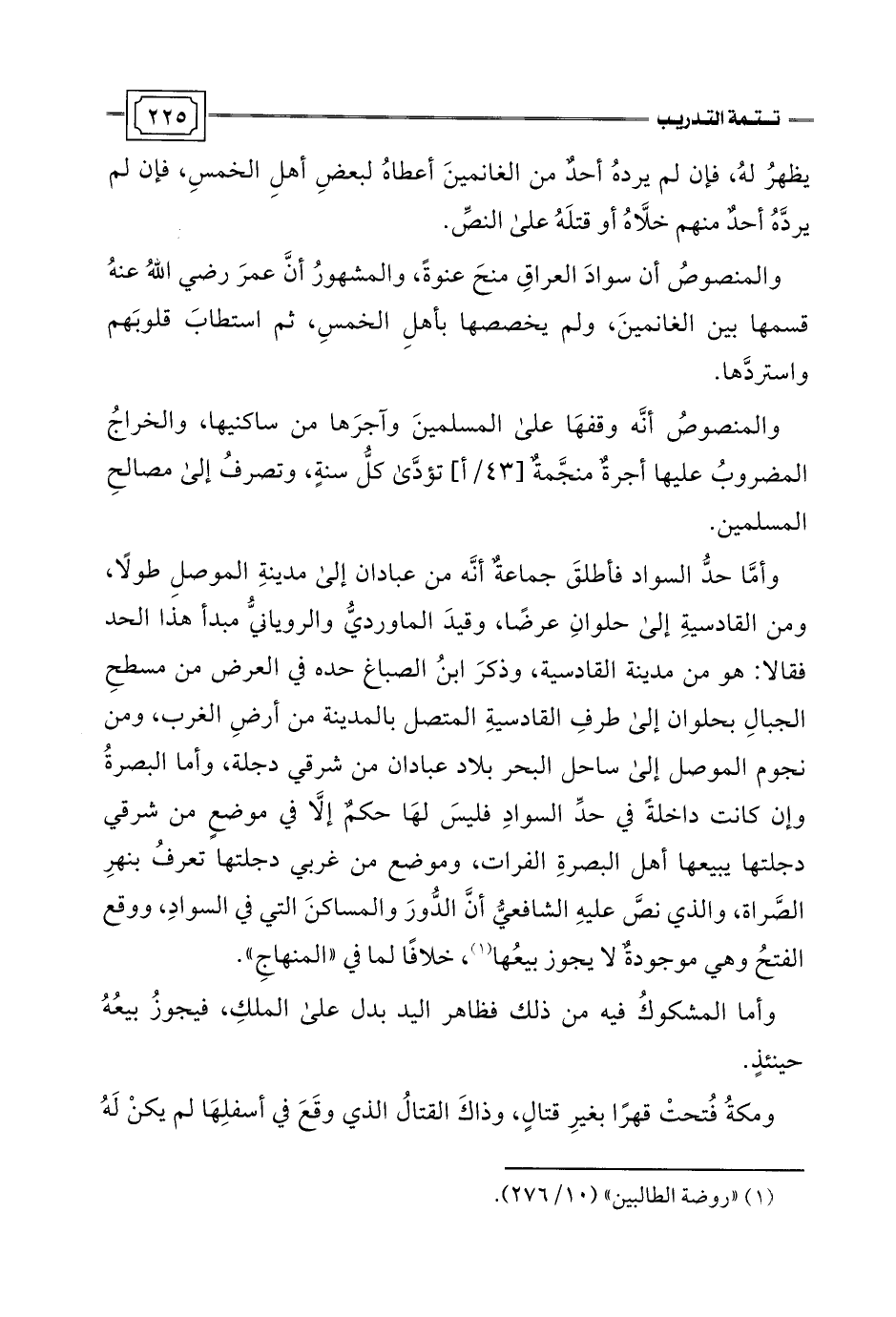 وأمَّا حدُّ السواد فأطلقَ جماعةٌ أنَّه من عبادان إلى مدينةِ الموصلِ طولًا، ومن القادسيةِ إلى حلوانِ عرضًا، وقيدَ الماورديُّ والرويانيُّ مبدأ هذا الحد فقالا: هو من مدينة القادسية، وذكرَ ابنُ الصباغ حده في العرض من مسطحِ الجبالِ بحلوان إلى طرفِ القادسيةِ المتصل بالمدينة من أرضِ الغرب، ومن نجوم الموصل إلى ساحل البحر بلاد عبادان من شرقي دجلة، وأما البصرةُ وإن كانت داخلةً في حدِّ السوادِ فليسَ لهَا حكمٌ إلَّا في موضعٍ من شرقي دجلتها يبيعها أهل البصرةِ الفرات، وموضع من غربي دجلتها تعرفُ بنهرِ الصَّراة، والذي نصَّ عليهِ الشافعيُّ أنَّ الدُّورَ والمساكنَ التي في السوادِ، ووقع الفتحُ وهي موجودةٌ لا يجوز بيعُها (¬1)، خلافًا لما في "المنهاجِ".