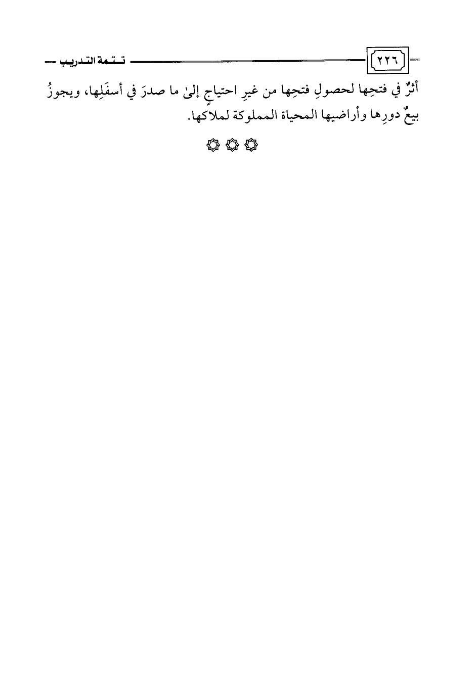 أثرٌ في فتحِها لحصولِ فتحِها من غيرِ احتياجٍ إلى ما صدرَ في أسفَلِها، ويجوزُ بيعٌ دورِها وأراضيها المحياة المملوكة لملاكها.