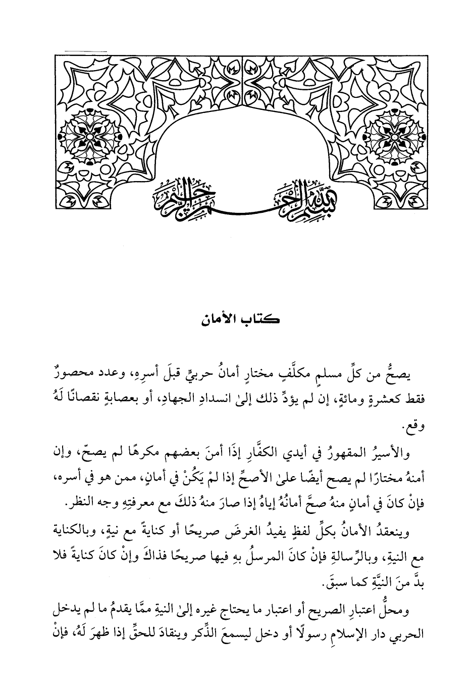 يصحُّ من كلِّ مسلمٍ مكلَّفٍ مختارٍ أمانُ حربيٍّ قبلَ أسرِهِ، وعدد محصورٌ فقط كعشرةٍ ومائةٍ، إن لم يؤدِّ ذلك إلى انسدادِ الجهادِ، أو بعصابةٍ نقصانًا لَهُ وقع.