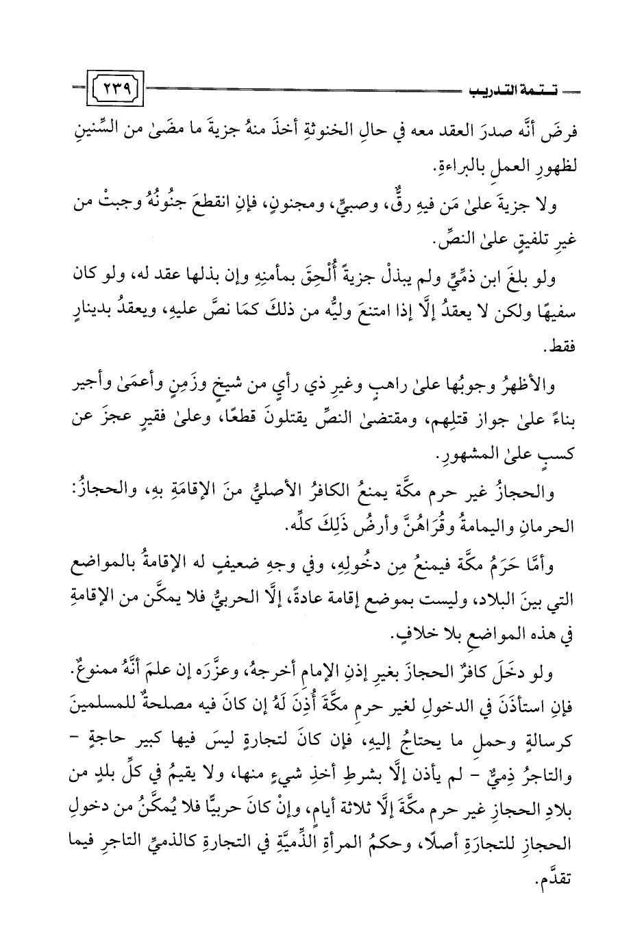 ولو دخَلَ كافرٌ الحجازَ بغيرِ إذنِ الإمامِ أخرجهُ، وعزَّرَه إن علمَ أنَّهُ ممنوعٌ. فإنِ استأذَنَ في الدخولِ لغير حرمِ مكَّةَ أُذِنَ لَهُ إن كانَ فيه مصلحةٌ للمسلمينَ كرسالةٍ وحملِ ما يحتاجُ إليهِ، فإن كانَ لتجارةٍ ليسَ فيها كبير حاجةٍ -والتاجرُ ذِميٌّ- لم يأذن إلَّا بشرطِ أخذِ شيءٍ منها، ولا يقيمُ في كلِّ بلدٍ من بلادِ الحجازِ غير حرم مكَّةَ إلَّا ثلاثة أيامٍ، وإنْ كانَ حربيًّا فلا يُمكَّنُ من دخولِ الحجازِ للتجارَةِ أصلًا، وحكمُ المرأةِ الذِّميَّةِ في التجارةِ كالذميِّ التاجرِ فيما تقدَّم.