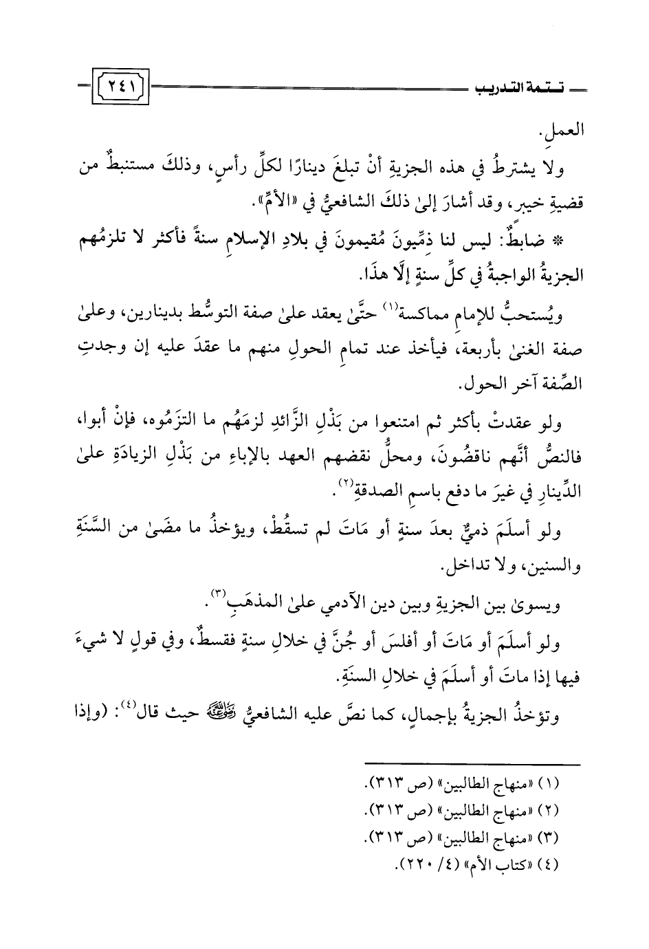 ولا يشترطُ في هذه الجزيةِ أَنْ تبلغَ دينارًا لكلِّ رأسٍ، وذلكَ مستنبطٌ من قضيةِ خيبرٍ، وقد أشارَ إلى ذلكَ الشافعيُّ في "الأمِّ".
