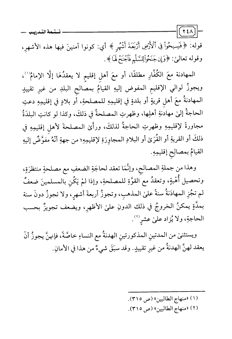 وهذا من جملةِ المصالحِ، وإنَّمَا تعقد لحاجَةِ الضعفِ مع مصلحةٍ منتظرَةٍ، وتحصيل أُهْبةٍ، وتعقدُ مع القوَّةِ للمصلحةِ، وإذا لمْ يَكُنِ بالمسلمينَ ضعفٌ لم تجُزِ المهادَنةُ سنةً على المذهبِ، وتجوزُ أربعةَ أشهرٍ، ولا تجوزُ دونَ سنة بمدَّةٍ يمكنُ الخروجُ في ذلك الدونِ على الأظهرِ، ويضعف تجويزٌ بحسب الحاجةِ، ولا يُزاد على عشرٍ (¬2).