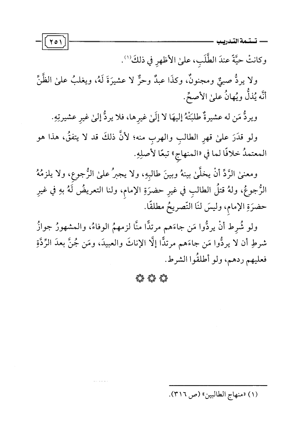 ولو شُرِط أَنْ يردُّوا مَن جاءَهم مرتدًّا منَّا لزمهمُ الوفاءُ، والمشهورُ جوازُ شرطِ أن لا يردُّوا مَن جاءَهم مرتدًّا إلَّا الإناثَ والعبيدَ، ومَن جُنَّ بعدَ الرِّدَّةِ فعليهم ردهم، ولو أطلقُوا الشرط.