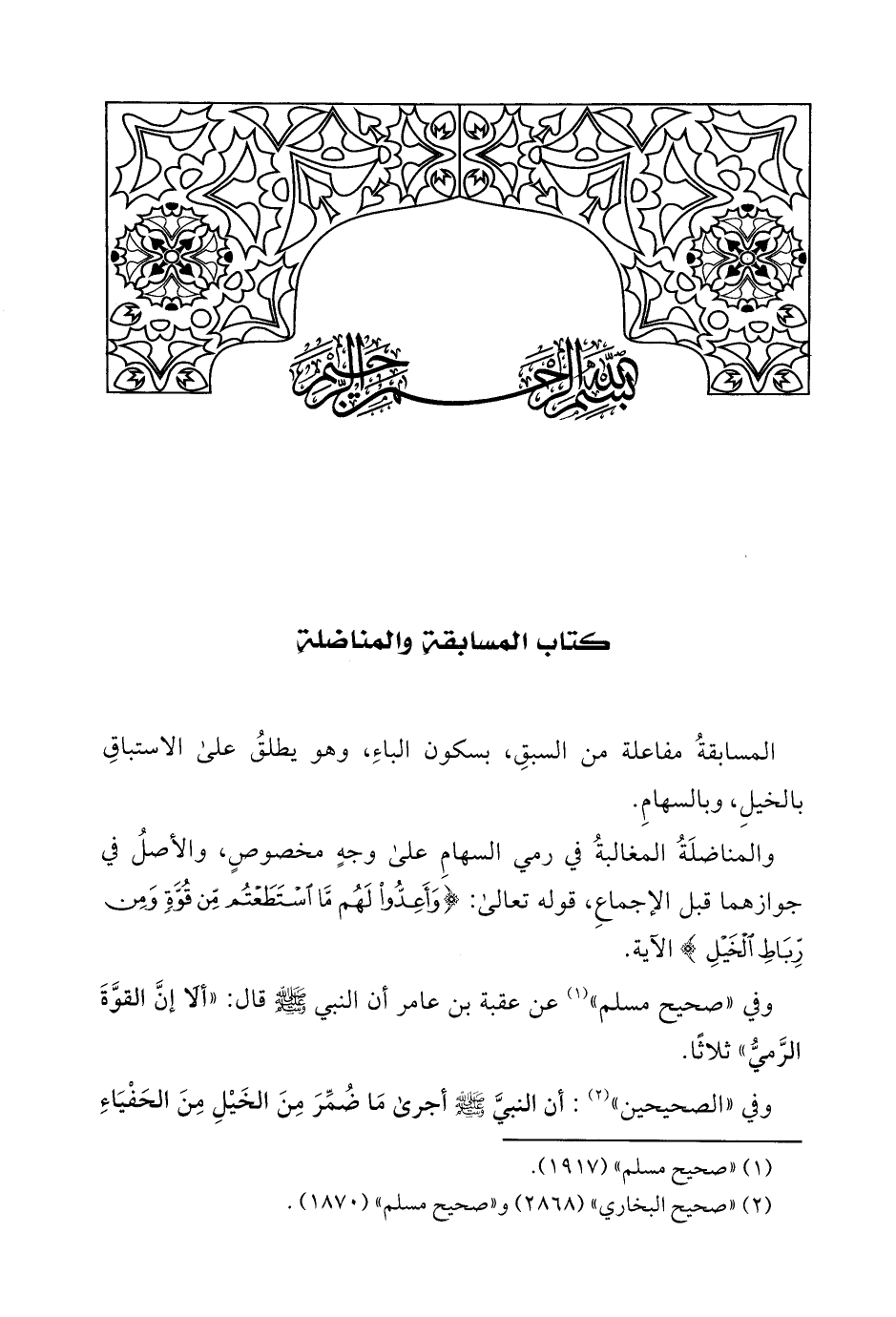 والمناضلَةُ المغالبةُ في رمي السهامِ على وجهٍ مخصوصٍ، والأصلُ في جوازهما قبل الإجماعِ، قوله تعالى: {وَأَعِدُّوا لَهُمْ مَا اسْتَطَعْتُمْ مِنْ قُوَّةٍ وَمِنْ رِبَاطِ الْخَيْلِ} الآية.