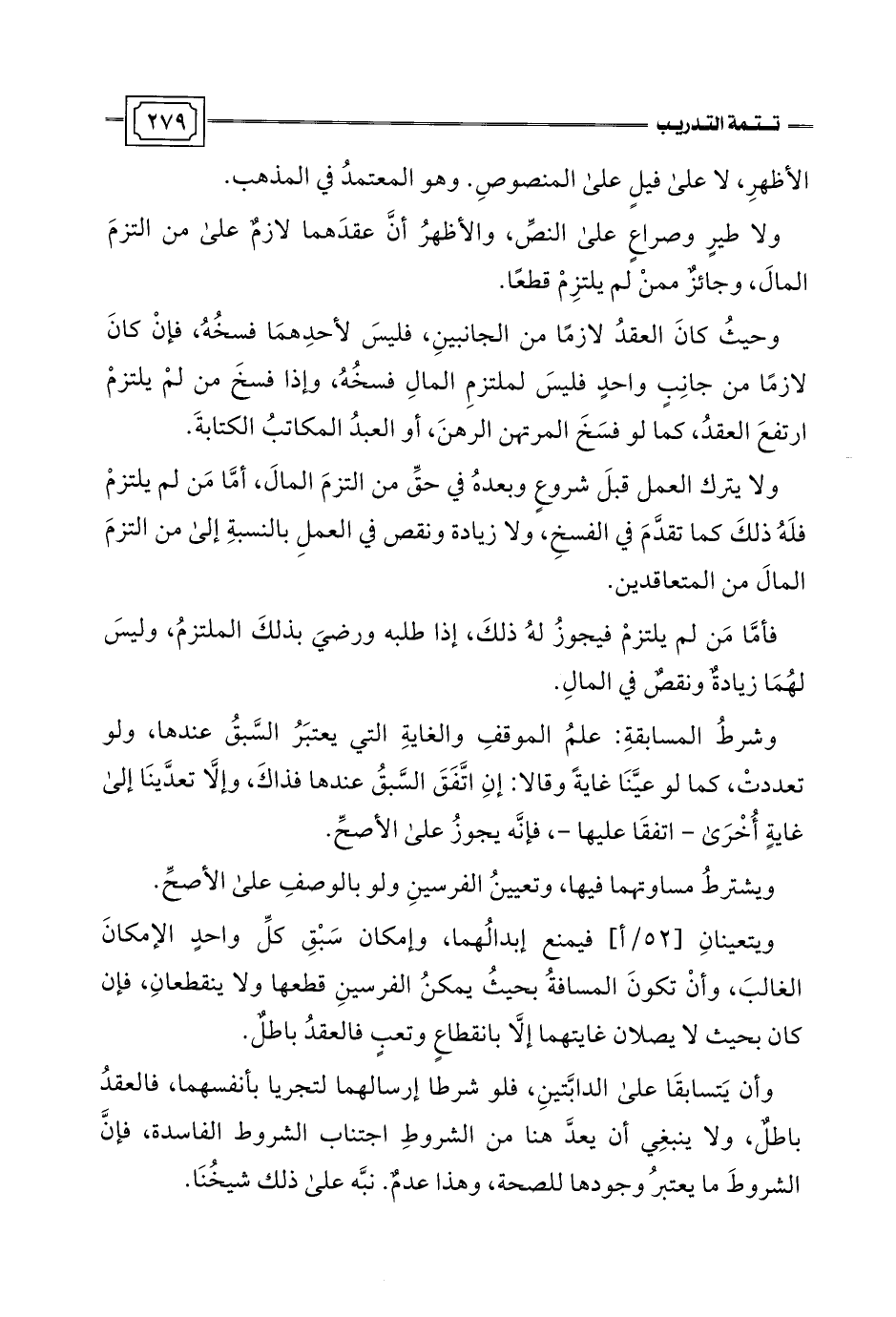 وأن يَتسابقَا على الدابَّتينِ، فلو شرطا إرسالهما لتجريا بأنفسهما، فالعقدُ باطلٌ، ولا ينبغِي أن يعدَّ هنا من الشروطِ اجتناب الشروط الفاسدة، فإنَّ الشروطَ ما يعتبرُ وجودها للصحة، وهذا عدمٌ. نبَّه على ذلك شيخُنَا.