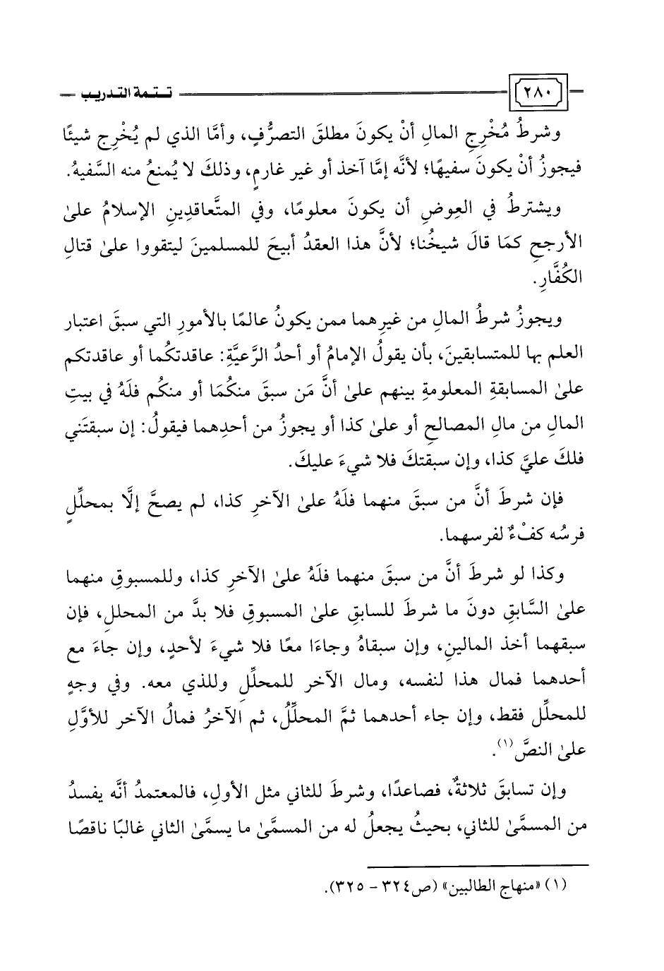 ويجوزُ شرطُ المالِ من غيرِهما ممن يكونُ عالمًا بالأمورِ التي سبقَ اعتبار العلم بها للمتسابقينَ، بأن يقولُ الإمامُ أو أحدُ الرَّعيَّةِ: عاقدتكُما أو عاقدتكم على المسابقةِ المعلومةِ بينهم على أنَّ مَن سبقَ منكُمَا أو منكُم فلَهُ في بيتِ المالِ من مالِ المصالحِ أو على كذا أو يجوزُ من أحدِهما فيقولُ: إن سبقتَني فلكَ عليَّ كذا، وإن سبقتكَ فلا شيءَ عليكَ.