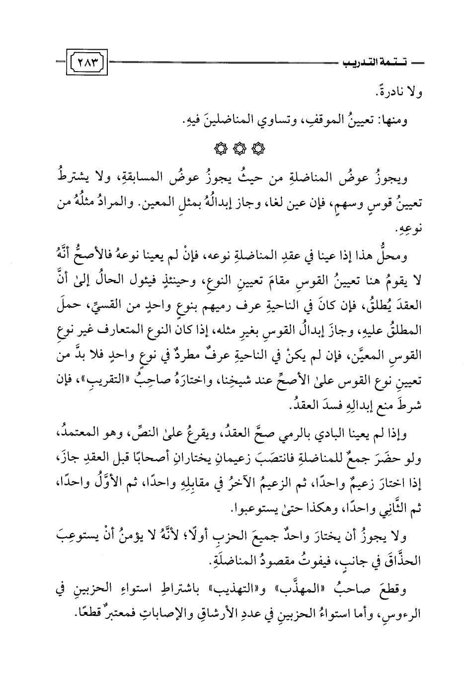ولا يجوزُ أن يختارَ واحدٌ جميعَ الحزبِ أولًا؛ لأنَّهُ لا يؤمنُ أَنْ يستوعِبَ الحذَّاقَ في جانبٍ، فيفوتُ مقصودُ المناضلَةِ.