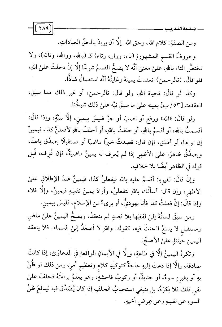 وحروفُ القسمِ المشهورةِ (باء، وواو، وتاء) كـ (باللَّه، وواللَّه، وتاللَّه)، ولا تختصُّ التاء باللَّهِ، على معنى أنَّه لا يصحُّ القسمُ شرعًا إلَّا إنْ دخلتْ على اللَّهِ، فلو قالَ: (تالرحمن) انعقدتْ يمينهُ وغايتُهُ أنَّه استعمالٌ شاذًّا.