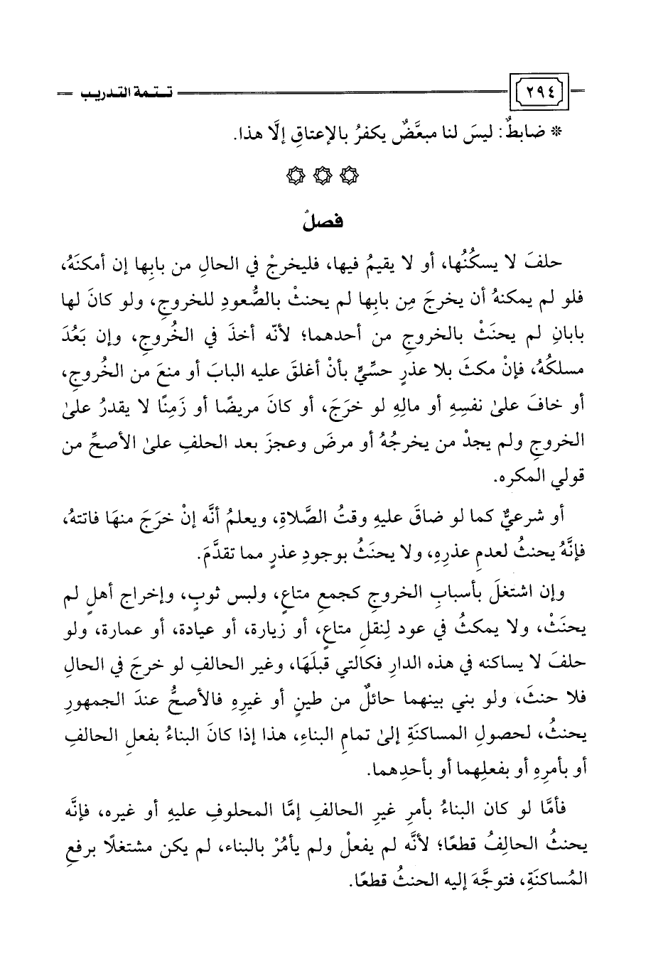 حلفَ لا يسكُنُها، أو لا يقيمُ فيها، فليخرجْ في الحالِ من بابِها إن أمكنَهُ، فلو لم يمكنهُ أن يخرجَ مِن بابِها لم يحنثْ بالصُّعودِ للخروجِ، ولو كانَ لها بابانِ لم يحنَثْ بالخروجِ من أحدهما؛ لأنّه أخذَ في الخُروجِ، وإن بَعُدَ مسلكُهُ، فإنْ مكثَ بلا عذرٍ حسِّيٍّ بأنْ أغلقَ عليه البابَ أو منعَ من الخُروجِ، أو خافَ على نفسِهِ أو مالِهِ لو خرَجَ، أو كانَ مريضًا أو زَمِنًا لا يقدرُ على الخروجِ ولم يجدْ من يخرجُهُ أو مرضَ وعجزَ بعد الحلفِ على الأصحِّ من قولي المكره.