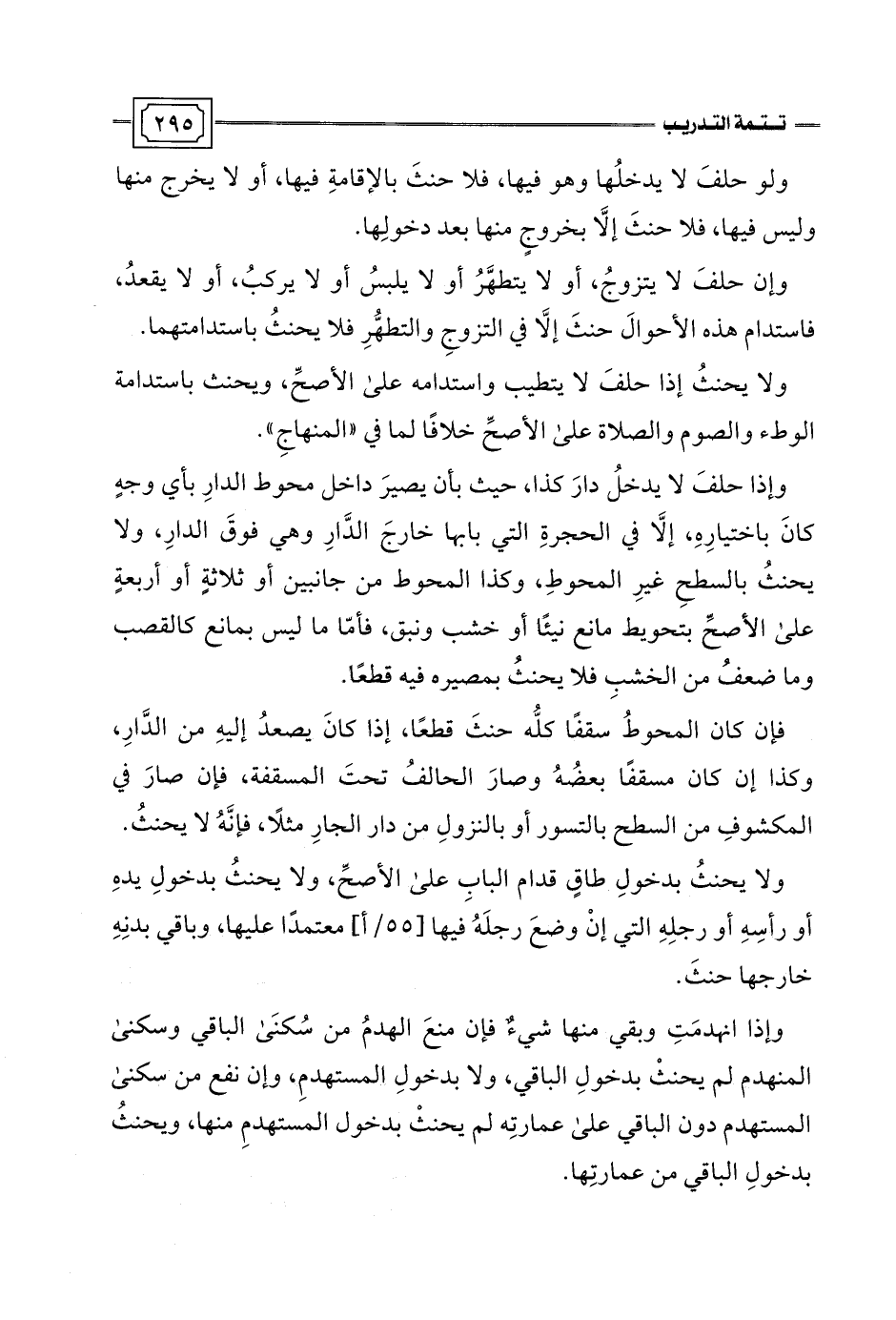 وإذا حلفَ لا يدخلُ دارَ كذا، حيث بأن يصيرَ داخل محوط الدارِ بأي وجهٍ كانَ باختيارِهِ، إلَّا في الحجرةِ التي باجها خارجَ الدَّارِ وهي فوقَ الدارِ، ولا يحنثُ بالسطحِ غيرِ المحوطِ، وكذا المحوط من جانبين أو ثلاثةٍ أو أربعةٍ على الأصحِّ بتحويط مانع نيئًا أو خشب ونبق، فأمّا ما ليس بمانع كالقصب وما ضعفُ من الخشبِ فلا يحنثُ بمصيره فيه قطعًا.
