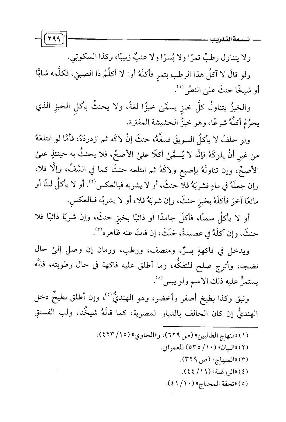 ولو حلفَ لا يأكلُ السويقَ فسفَّهُ، حنثَ إنْ لاكَه ثم ازدردَهُ، فأمَّا لو ابتلعَهُ من غيرِ أَنْ يلوكَهُ فإنَّه لا يُسمَّى أكلًا على الأصحِّ، فلا يحنثُ به حينئذٍ على الأصحِّ، وإن تناولَهُ بإصبعٍ ولاكَهُ ثم ابتلعه حنثَ كما في السَّفِّ، وإلَّا فلا، وإن جعلَهُ في ماءٍ فشربَهُ فلا حنثَ، أو لا يشربه فبالعكس (¬2). أو لا يأكلُ لبنًا أو مائعًا آخرَ فأكلَهُ بخبزٍ حنثَ، وإن شربَهُ فلا، أو لا يشربُه فبالعكسِ.