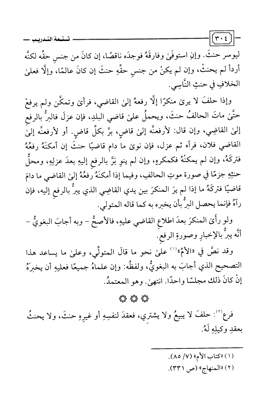 وإذا حلفَ لا يرى منكرًا إلَّا رفعهُ إلى القاضي، فرأى وتمكَّن ولم يرفعْ حتَّى ماتَ الحالفُ حنثَ، ويحملُ على قاضي البلدِ، فإن عزلَ فالبرُّ بالرفعِ إلى القاضِي، وإن قال: لأرفعنَّه إلى قاضٍ، برَّ بكلِّ قاضٍ. أو لأرفعنَّه إلى القاضي فلان، فرآه ثم عزل، فإن نوى ما دام قاضيًا حنثَ إن أمكنَهُ رفعُهُ فتركَهُ، وإن لم يمكنْهُ فكمكرهٍ، وإن لم ينوِ بَرَّ بالرفعِ إليهِ بعدَ عزلِهِ، ومحلُّ حنثِهِ جزمًا في صورة موتِ الحالفِ، وفيما إذا أمكنَهُ رفعُهُ إلى القاضي ما دامَ قاضيًا فتركَهُ ما إذا لم يرَ المنكرَ بين يدي القاضِي الذي يبرُّ بالرفعِ إليه، فإن رآهُ فإنما يحصل البرُّ بأن يخبره به كما قاله المتولي.