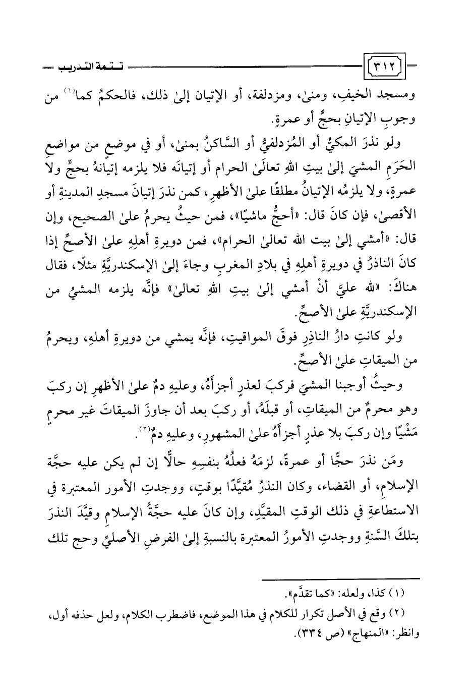 ولو نذرَ المكيُّ أو المُزدلفيُّ أو السَّاكنُ بمنى، أو في موضعٍ من مواضعِ الحَرَمِ المشيَ إلى بيتِ اللَّهِ تعالَى الحرام أو إتيانَه فلا يلزمه إتيانهُ بحجٍّ ولا عمرةٍ، ولا يلزمُه الإتيانُ مطلقًا على الأظهرِ، كمن نذرَ إتيانَ مسجدِ المدينةِ أو الأقصى، فإن كانَ قال: "أحجُّ ماشيًا"، فمن حيثُ يحرمُ على الصحيح، وإن قال: "أمشي إلى بيت اللَّه تعالى الحرام"، فمن دويرةِ أهلِهِ على الأصحِّ إذا كانَ الناذرُ في دويرةِ أهلِهِ في بلادِ المغربِ وجاءَ إلى الإسكندريَّةِ مثلًا، فقال هناكَ: "للَّه عليَّ أَنْ أمشي إلى بيتِ اللَّهِ تعالى" فإنَّه يلزمه المشي من الإسكندريَّةِ على الأصحِّ.