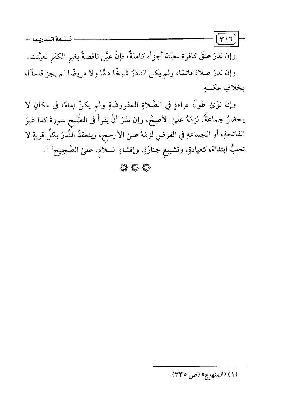 وإن نوَى طولَ قراءةٍ في الصَّلاةِ المفروضَةِ ولم يكنْ إمامًا في مكانٍ لا يحضرُ جماعةً، لزمَهُ على الأصحِّ، وإن نذرَ أَنْ يقرأَ في الصُّبحِ سورةَ كذا غيرَ الفاتحةِ، أو الجماعةِ في الفرضِ لزمَهُ على الأرجحِ، وينعقدُ النَّذرُ بكلِّ قربةٍ لا تجبُ ابتداءً، كعيادةٍ، وتشييعِ جنازَةٍ، وإفشاءِ السلامِ، على الصَّحِيح (¬1).