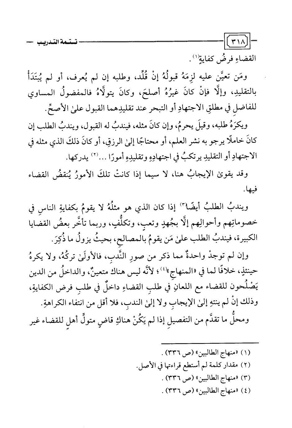 ويكرَهُ طلبه، وقيلَ يحرمُ، وإن كانَ مثله، فيندبُ له القبول، ويندبُ الطلب إن كانَ خاملًا يرجو به نشر العلم، أو محتاجًا إلى الرزقِ، أو كانَ ذلكَ الذي مثله في الاجتهادِ أو التقليدِ يرتكبُ في اجتهادِهِ وتقليدِهِ أمورًا. . . (¬2) يدركها.