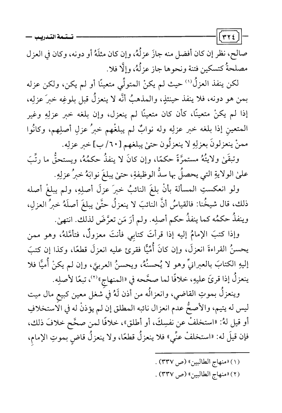 ولو انعكستِ المسألة بأنْ بلغَ النائبُ خبرَ عزلَ أصلِهِ، ولم يبلغْ أصله ذلك، قال شيخُنا: فالقياسُ أنَّ النائبَ لا ينعزلُ حتَّى يبلغَ أصلَهُ خبرُ العزلِ، وينفذُ حكمُه كما ينفذُ حكم أصلِه. ولم أرَ مَن تعرَّضَ لذلك. انتهى.