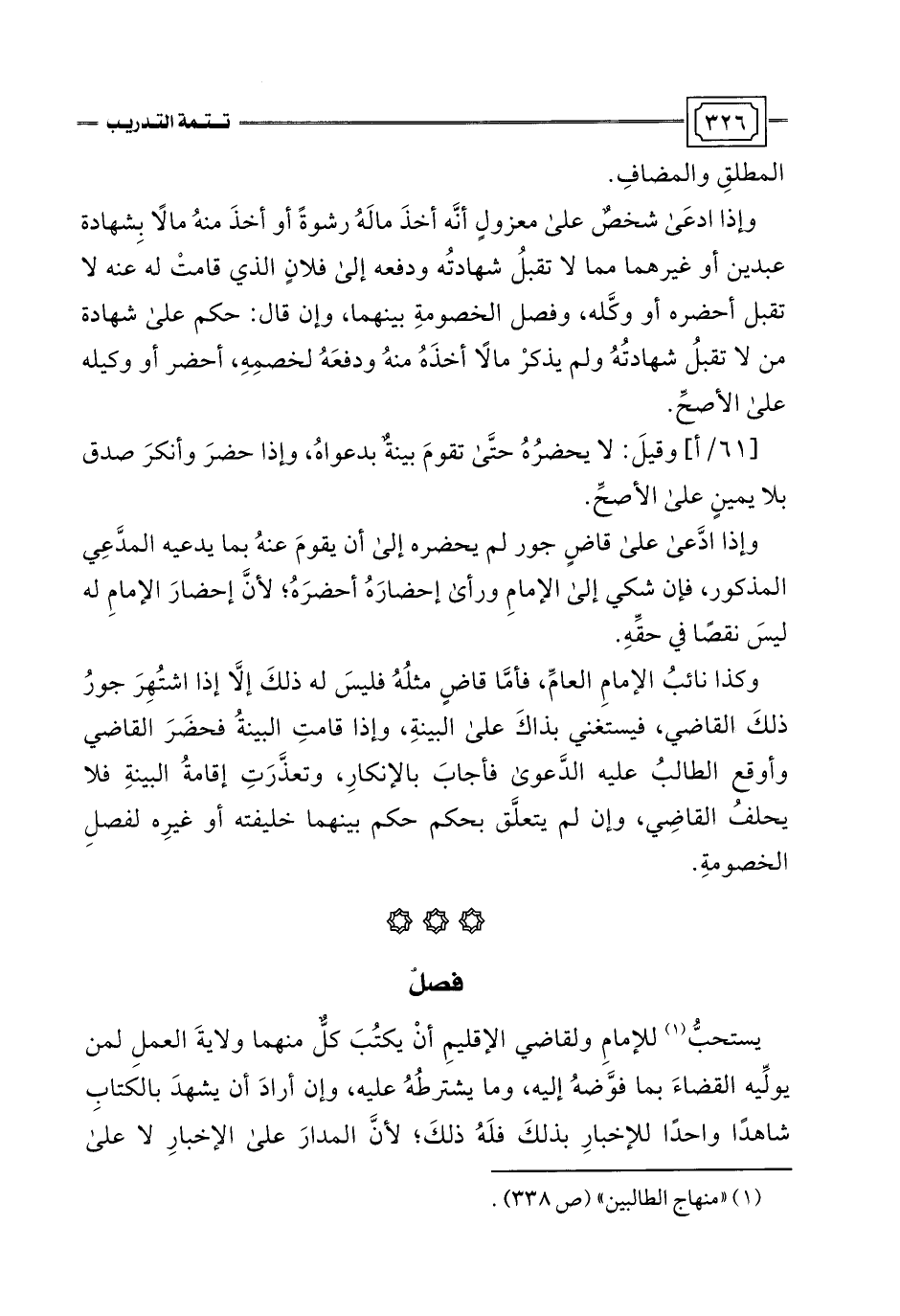 وكذا نائبُ الإمامِ العامِّ، فأمَّا قاضٍ مثلُهُ فليسَ له ذلكَ إلَّا إذا اشتُهِرَ جورُ ذلكَ القاضي، فيستغني بذاكَ على البينةِ، وإذا قامتِ البينةُ فحضَرَ القاضي وأوقع الطالبُ عليه الدَّعوى فأجابَ بالإنكارِ، وتعذَّرَتِ إقامةُ البينةِ فلا يحلفُ القاضِي، وإن لم يتعلَّق بحكم حكم بينهما خليفته أو غيرِه لفصلِ الخصومةِ.