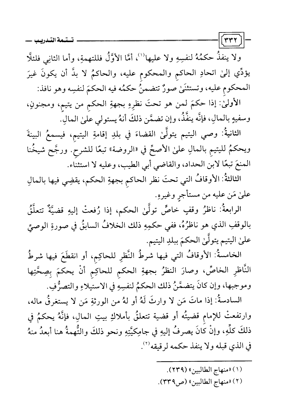 ولا ينفذُ حكمُهُ لنفسِهِ ولا عليها (¬1)، أمَّا الأوَّلُ فللتهمةِ، وأما الثانِي فلئلَّا يؤدِّي إلى اتحادِ الحاكمِ والمحكومِ عليه، والحاكمُ لا بدَّ أن يكونَ غيرَ المحكومِ عليه، وتستثنَى صورٌ تتضمنُ حكمُه فيه الحكمَ لنفسِه وهو نافذ: