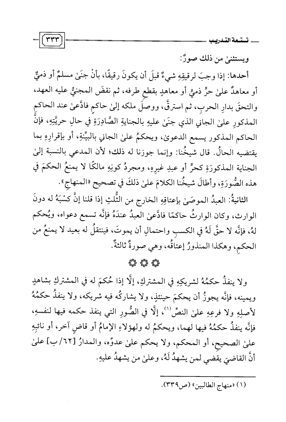 أحدها: إذا وجبَ لرقيقِهِ شيءٌ قبلَ أن يكونَ رقيقًا، بأنْ جنَى مسلمٌ أو ذميٌّ أو معاهدٌ على حرٍّ ذميٍّ أو معاهدٍ بقطعِ طرفه، ثم نقضَ المجنيُّ عليه العهد، والتحقَ بدارِ الحربِ، ثم استرقَّ، ووصلَ ملكه إلى حاكمٍ فادَّعى عند الحاكمِ المذكورِ على الجاني الذي جنَى عليهِ بالجنايةِ الصَّادِرَةِ في حالِ حريَّتِهِ، فإنَّ الحاكم المذكور يسمع الدعوى، ويحكمُ على الجاني بالبيِّنةِ، أو بإقرارِهِ بما يقتضيه الحالُ. قال شيخُنا: وإنما جوزنا له ذلك؛ لأن المدعي بالنسبة إلى الجناية المذكورَةِ كحرٍّ أو عبدِ غيرِهِ، ومجردُ كونِهِ مالكًا لا يمنعُ الحكمَ في هذه الصُّورَةِ، وأطالَ شيخُنا الكلامَ على ذلكَ في تصحيح "المنهاجِ".