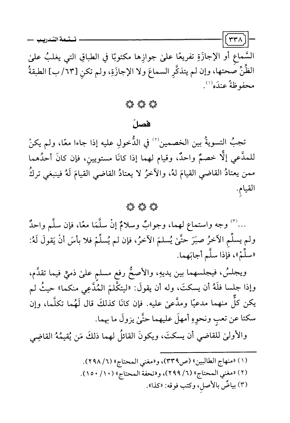 تجبُ التسويةُ بين الخصمين (¬2) في الدُّخولِ عليه إذا جاءا معًا، ولم يكنْ للمدَّعي إلَّا خصمٌ واحدٌ، وقيام لهما إذا كانَا مستويينِ، فإن كانَ أحدُهما ممن يعتادُ القاضي القيامَ لهُ، والآخرُ لا يعتادُ القاضي القيامَ لَهُ فينبغي تركُ القيامِ.