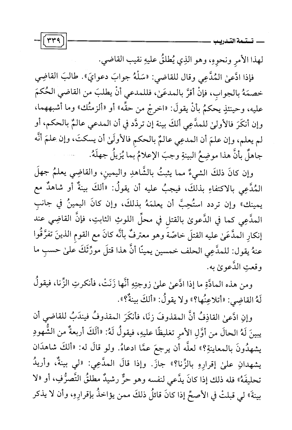ومن هذه المادَّةِ ما إذا ادَّعى على زوجتِهِ أنَّها زَنَتْ، فأنكرتِ الزِّنا، فيقولُ لَهُ القاضِي: "أتلاعِنُها؟ " ولا يقولُ: "ألكَ بينةٌ؟ ".