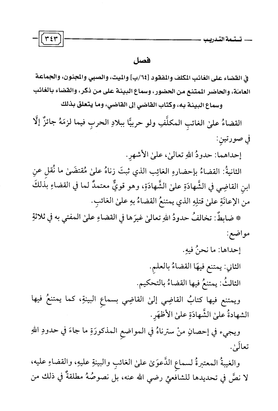 فصل في القضاء على الغائب المكلف والمفقود والميت، والصبي والمجنون، والجماعة العامَّة، والحاضر الممتنع من الحضور، وسماع البينة على من ذكر، والقضاء بالغائب وسماع البينة به، وكتاب القاضي إلى القاضي، وما يتعلق بذلك