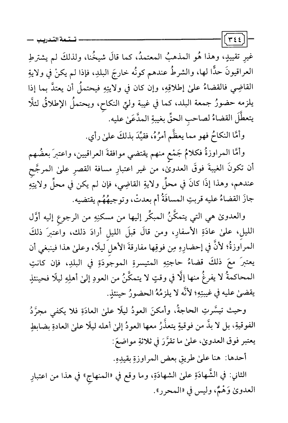 غيرِ تقييدٍ، وهذا هُو المذهبُ المعتمدُ، كما قالَ شيخُنا، ولذلكَ لم يشترطِ العراقيونَ حدًّا لها، والشرطُ عندهم كونُه خارجَ البلدِ، فإذا لم يكنْ في ولايةِ القاضِي فالقضاءُ على إطلاقِهِ، وإن كان في ولايتِهِ فيحتملُ أن يعتدَّ بما إذا يلزمه حضورُ جمعة البلد، كما في غيبة وليِّ النكاحِ، ويحتملُ الإطلاقُ لئلَّا يتعطَّلَ القضاءُ لصاحبِ الحقِّ بغيبةِ المدَّعَى عليه.