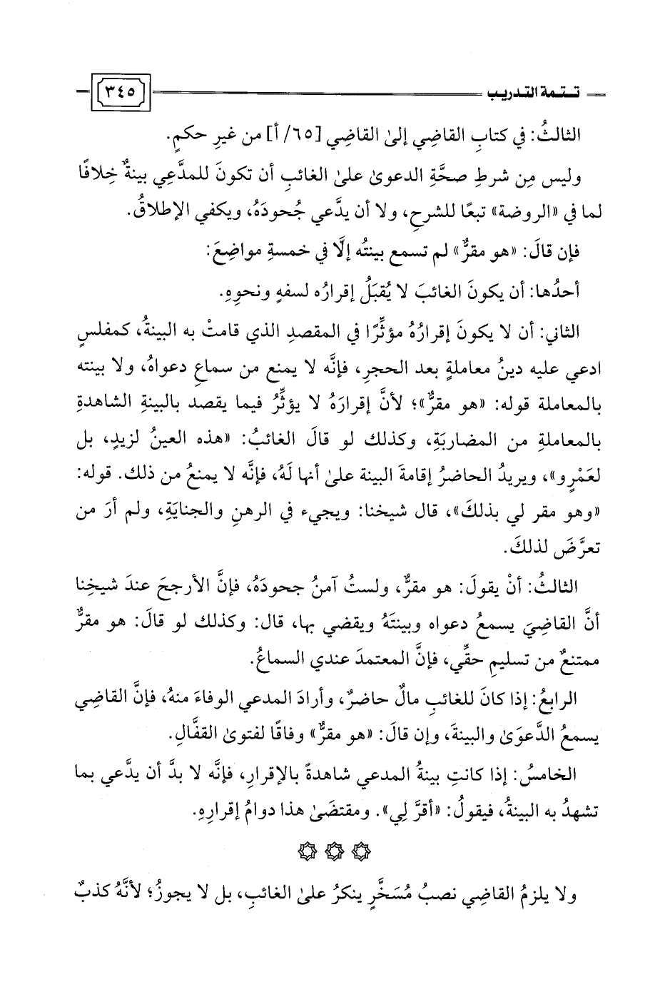 الثاني: أن لا يكونَ إقرارُهُ مؤثِّرًا في المقصدِ الذي قامتْ به البينةُ، كمفلسٍ ادعي عليه دينُ معاملةٍ بعد الحجرِ، فإنَّه لا يمنع من سماعِ دعواهُ، ولا بينته بالمعاملة قوله: "هو مقرٌّ"، لأنَّ إقرارَهُ لا يؤثِّرُ فيما يقصد بالبينةِ الشاهدةِ بالمعاملةِ من المضاربَةِ، وكذلك لو قالَ الغائبُ: "هذه العينُ لزيدٍ، بل لعَمْرٍو"، ويريدُ الحاضرُ إقامةَ البينة على أنها لَهُ، فإنَّه لا يمنعُ من ذلك. قوله: "وهو مقر لي بذلكَ"، قال شيخنا: ويجيء في الرهنِ والجنايَةِ، ولم أرَ من تعرَّضَ لذلكَ.