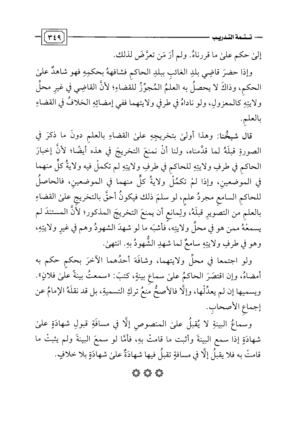قال شيخُنا: وهذا أولي بتخريجِهِ على القضاءِ بالعلمِ دونَ ما ذكرَ في الصورةِ قبلَهُ لما قدَّمناه، ولنا أَنْ نمنعَ التخريجَ في هذه أيضًا؛ لأنَّ إخبارَ الحاكمِ في طرفِ ولايتِهِ للحاكمِ في طرفِ ولايتِهِ لم تكملْ فيه ولايةُ كلٍّ منهما في الموضعينِ، وإذا لمْ تكمُلْ ولايةُ كلٍّ منهما في الموضعينِ، فالحاصلُ للحاكمِ السامعِ مجردُ علمٍ، لو سلمَ ذلك فيكونُ أحقَّ بالتخريجِ على القضاءِ بالعلمِ من التصويرِ قبلَهُ، ولِمانعٍ أن يمنعَ التخريجَ المذكور؛ لأنَّ المستندَ لم يسمعْهُ ممن هو في محلِّ ولايتِه، فأشبَه ما لو شهدَ الشهودُ وهم في غيرِ ولايتِهِ، وهو في طرفِ ولايتِهِ سامعٌ لما شهدِ الشُّهودُ بهِ. انتهى.
