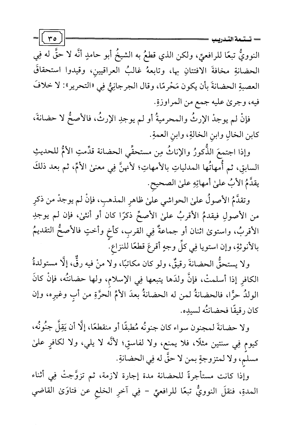 النوويُّ تبعًا للرافعيِّ، ولكن الذي قطعُ به الشيخُ أبو حامدٍ أنَّه لا حقَّ له فِي الحضانةِ مخافةَ الافتتانِ بها، وتابعهُ غالبُ العراقيينِ، وقيدوا استحقاقَ العصبةِ الحضانةَ بأن يكون مَحْرمًا، وقال الجرجانِيُّ فِي "التحرير": لا خلافَ فيه، وجرى عليه جمع من المراوزةِ.