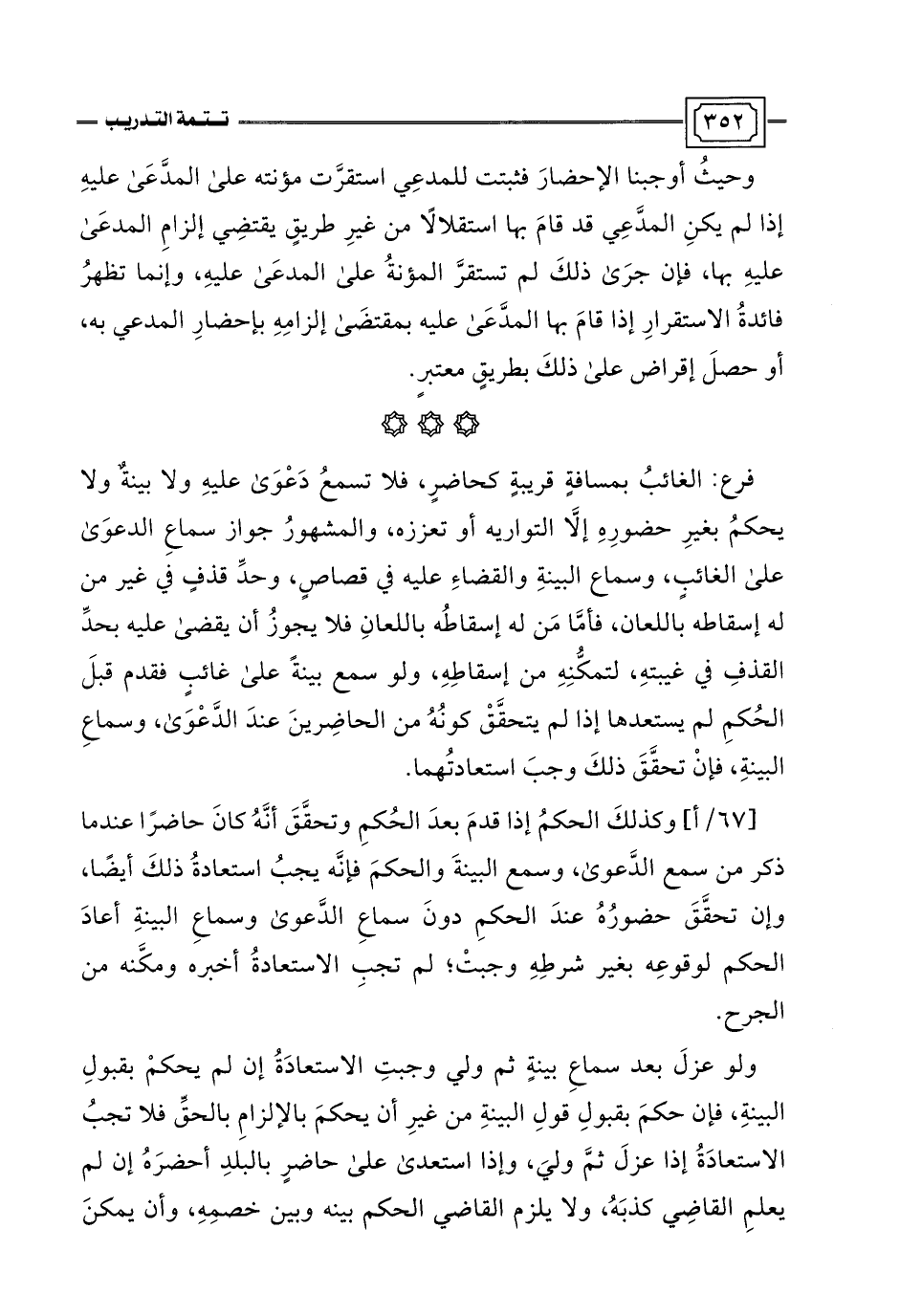 فرع: الغائبُ بمسافةٍ قريبةٍ كحاضرٍ، فلا تسمعُ دَعْوَى عليهِ ولا بينةٌ ولا يحكمُ بغيرِ حضورِهِ إلَّا التواريه أو تعززه، والمشهورُ جواز سماعِ الدعوَى على الغائبٍ، وسماع البينةِ والقضاءِ عليه في قصاصٍ، وحدِّ قذفٍ في غير من له إسقاطه باللعان، فأمَّا مَن له إسقاطُه باللعانِ فلا يجوزُ أن يقضى عليه بحدِّ القذفِ في غيبتهِ، لتمكُّنِهِ من إسقاطِهِ، ولو سمع بينةً على غائبٍ فقدم قبلَ الحُكمِ لم يستعدها إذا لم يتحقَّقْ كونُهُ من الحاضِرينَ عندَ الدَّعْوَى، وسماعِ البينةِ، فإنْ تحقَّقَ ذلكَ وجبَ استعادتُهما.