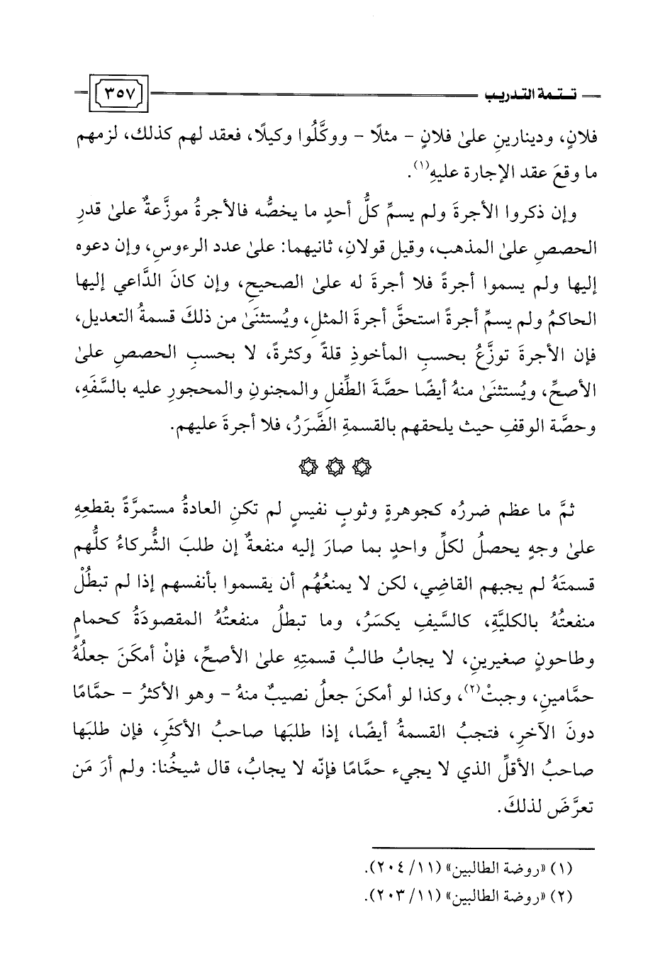 وإن ذكروا الأجرةَ ولم يسمِّ كلُّ أحدٍ ما يخصُّه فالأجرةُ موزَّعةٌ على قدرِ الحصصِ على المذهب، وقيل قولانِ، ثانيهما: على عدد الرءوسِ، وإن دعوه إليها ولم يسموا أجرةً فلا أجرةَ له على الصحيحِ، وإن كانَ الدَّاعي إليها الحاكمُ ولم يسمِّ أجرةً استحقَّ أجرةَ المثلِ، ويُستثنَى من ذلكَ قسمةُ التعديل، فإن الأجرةَ توزَّعُ بحسبِ المأخوذِ قلةً وكثرةً، لا بحسبِ الحصصِ على الأصحِّ، ويُستثنَى منهُ أيضًا حصَّةَ الطِّفلِ والمجنونِ والمحجورِ عليه بالسَّفَهِ، وحصَّة الوقفِ حيمث يلحقهم بالقسمةِ الضَّرَرُ، فلا أجرةَ عليهم.