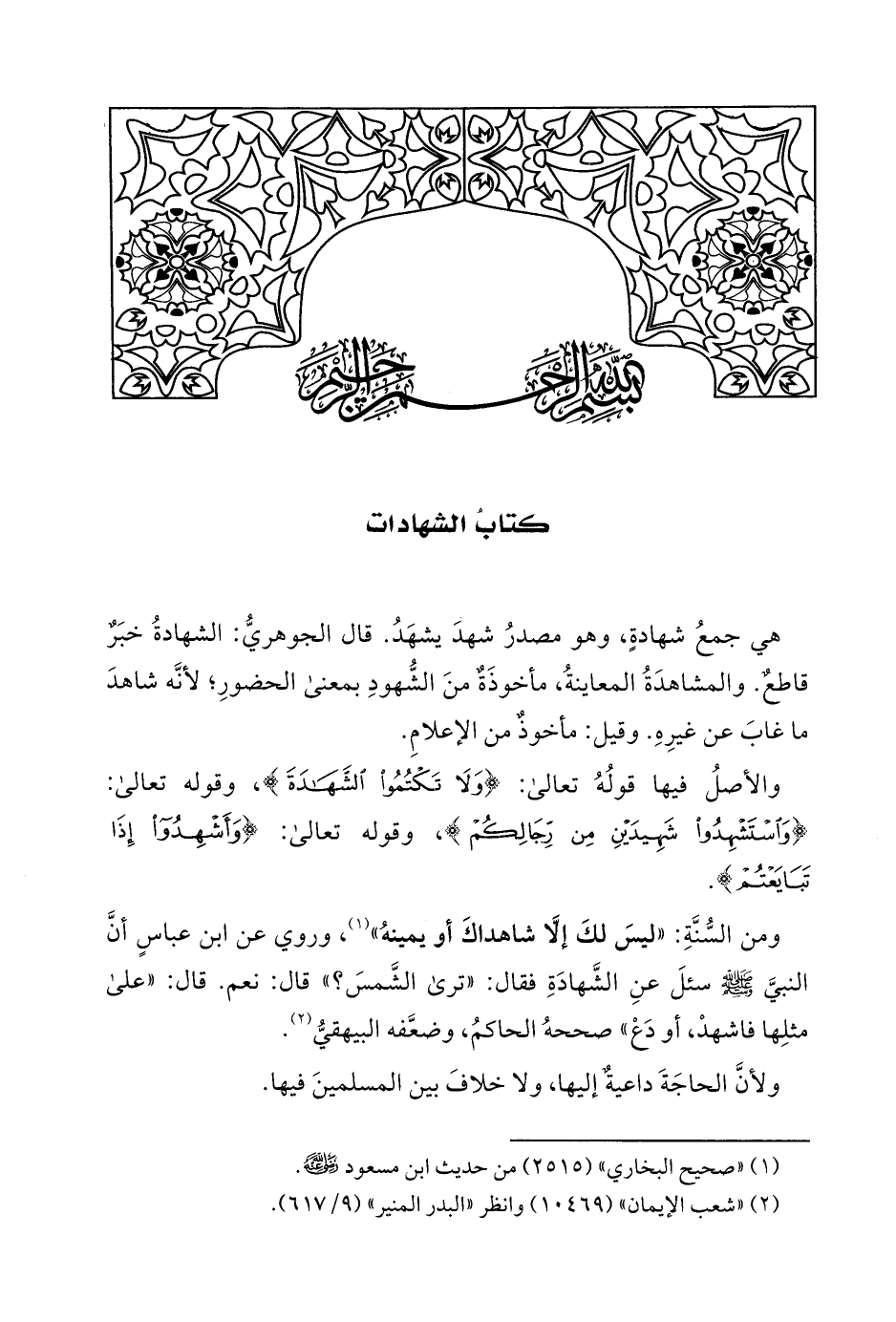 هي جمعُ شهادةٍ، وهو مصدرُ شهدَ يشهَدُ. قال الجوهريُّ: الشهادةُ خبَرٌ قاطعٌ. والمشاهدَةُ المعاينةُ، مأخوذَةٌ منَ الشُّهودِ بمعنى الحضورِ، لأنَّه شاهدَ ما غابَ عن غيرِهِ. وقيل: مأخوذٌ من الإعلامِ.